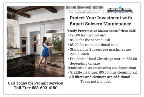 Don't wait for a breakdown and food lost- protect your Subzero with our expert maintenance service. Call us toll free at 888-693-4180 or use our online appointment request link.